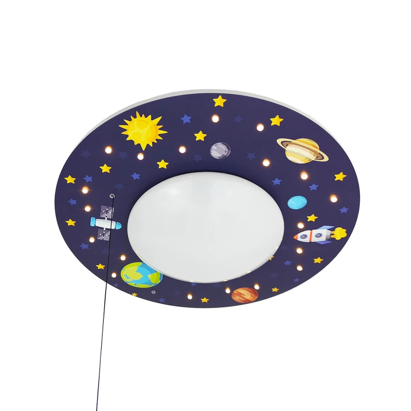 Με τραβηχτό διακόπτη: Φωτιστικό οροφής Universe με έναστρο ουρανό Το φωτιστικό οροφής Universe είναι ιδανικό τόσο για γενικό φωτισμό στο παιδικό δωμάτιο όσο και για τη λειτουργία του ως έναστρος ουρανός. 20 μεμονωμένες λυχνίες LED ενσωματωμένες στο πάνελ οροφής λάμπουν σαν μικρά αστέρια. Η κύρια πηγή φωτός είναι μια υποδοχή E27 (δεν περιλαμβάνεται λαμπτήρας). Αυτή μπορεί να απενεργοποιηθεί μέσω ενός τραβηχτού διακόπτη αν θέλετε να λάμπει μόνο ο έναστρος ουρανός. Το Space είναι ένα οπτικά εντυπωσιακό φωτιστικό παιδικού δωματίου με διάφορους πλανήτες και αστέρια καθώς και έναν πύραυλο και έναν δορυφόρο τυπωμένα στο σκούρο μπλε φόντο της πλάκας οροφής.