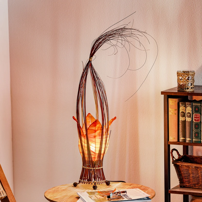 Επιτραπέζιο φωτιστικό Elena με μεγάλο, πορτοκαλί υφασμάτινο κάλυμμα σε σχήμα τουλίπας Το πρώτο πράγμα που παρατηρείτε στο επιτραπέζιο φωτιστικό Elena είναι το μεγάλο, πορτοκαλί υφασμάτινο λουλούδι. Αυτό αποτελεί το κάλυμμα για την πηγή φωτός και φωτίζεται επίσης όμορφα από αυτό όταν είναι αναμμένο. Αυτή η σκιά περιβάλλεται από πολλές σκούρες βιαστικές ράβδους που εξογκώνονται προς τα έξω και ενώνονται ξανά στην κορυφή με ένα σχοινί. Ωστόσο, αυτό μπορεί να παραλειφθεί προαιρετικά, ώστε οι κλωστές να απλώνονται σε όλες τις πλευρές. Ολόκληρος ο λαμπτήρας στέκεται σε τέσσερα στρογγυλά πόδια.