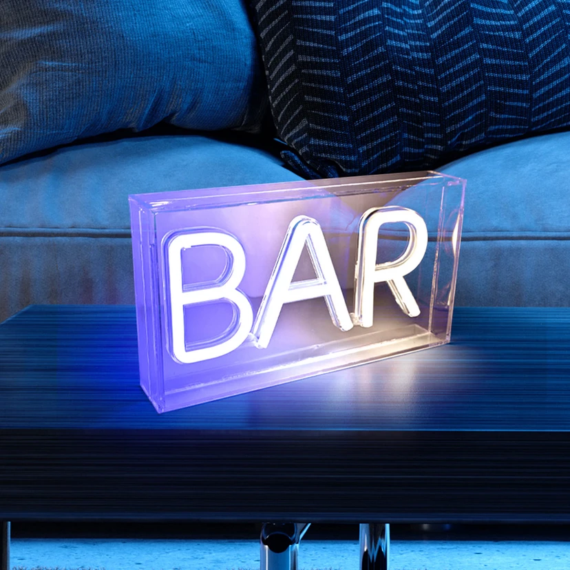 Ατμόσφαιρα πάρτι στο σπίτι: με το επιτραπέζιο φωτιστικό Neon Bar LED, USB Το επιτραπέζιο φωτιστικό Neon Bar LED είναι κατασκευασμένο από πλαστικό και έχει ορθογώνιο σχήμα με διαφανές περίβλημα. Στο εσωτερικό του, οι ενσωματωμένες λυχνίες LED έχουν τη μορφή γραμμάτων και παράγουν λευκό φως. Ένα καλώδιο USB με βύσμα USB-A (χωρίς προσαρμογέα δικτύου) και διακόπτης (on/off) είναι μόνιμα εγκατεστημένο.