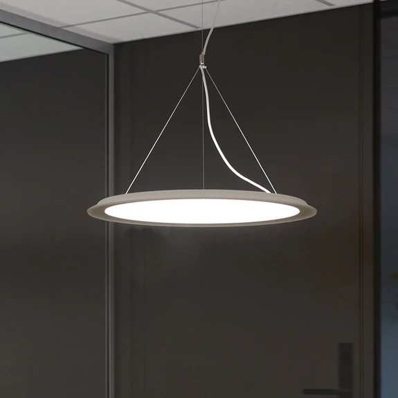 Στρογγυλό κρεμαστό φωτιστικό LED Appareo με δυνατότητα ρύθμισης DALI για λευκό καθολικό φωτισμό γραφείου και γενικό φωτισμό Με τον κομψό δακτυλιοειδή σχεδιασμό του, το κρεμαστό φωτιστικό LED Appareo μπορεί να ενσωματωθεί σε πολλούς σύγχρονους χώρους γραφείων, ρεσεψιόν και εμπορικών χώρων. Το στρογγυλό περίβλημα από χυτοπρεσσαριστό αλουμίνιο περιλαμβάνει ένα πρισματικό ακρυλικό διαχύτη που εμφανίζεται διαυγής όταν είναι απενεργοποιημένος. Κατά τη λειτουργία, το 57% του φωτός που κατευθύνεται στο πλάι εκπέμπεται προς τα κάτω και το 43% προς τα πάνω, παρέχοντας τόσο φωτισμό εργασίας όσο και φωτισμό περιβάλλοντος. Χάρη στον καλό έλεγχο της θάμβωσής του (UGR < 19), το Appareo μπορεί επίσης να χρησιμοποιηθεί πάνω από θέσεις εργασίας υπολογιστών. Το λευκό πλαστικό στέγαστρο είναι κατάλληλο τόσο για επιφανειακή τοποθέτηση στην οροφή με βίδες όσο και για τοποθέτηση σε κοίλες οροφές - μετατροπέας LED ενσωματωμένος στο στέγαστρο - εξωτερικά ρυθμιζόμενο με DALI - με τριπλή ανάρτηση καλωδίων- μπορεί να κοντύνει κατά την εγκατάσταση - παρέχεται έτοιμο για σύνδεση με παροχή ρεύματος