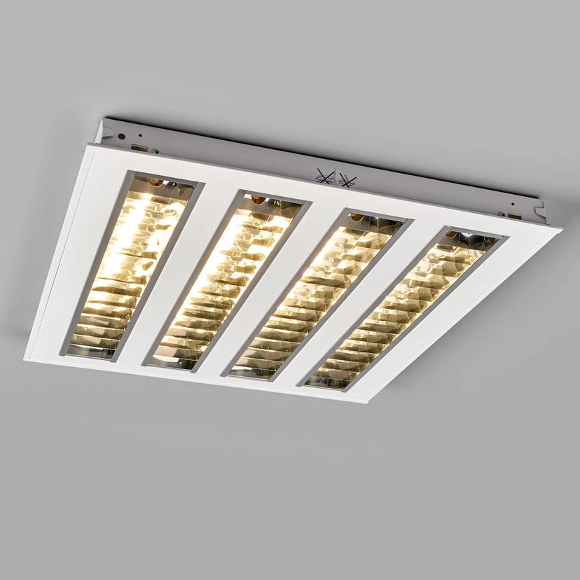 Τετράγωνη μονάδα χωνευτού φωτιστικού LED 625 με τέσσερις περσίδες Αυτό το χωνευτό φωτιστικό LED είναι εξοπλισμένο με μια τυπική διάσταση εγκατάστασης 62x62cm και τέσσερις παραβολικές περσίδες ανακλαστήρων από εξαιρετικά γυαλιστερό υπερκαθαρό αλουμίνιο. Ως αποτέλεσμα, είναι σε μεγάλο βαθμό απαλλαγμένο από θάμβωση και σύμφωνο με το UGR και πληροί τα πρότυπα για τον φωτισμό των χώρων εργασίας VDU. Η πρωτοποριακή τεχνολογία πρίσματος LED της Osram εξασφαλίζει όχι μόνο καλό φωτισμό, αλλά και ενεργειακή απόδοση και μεγάλη διάρκεια ζωής. Το περίβλημα του φωτιστικού είναι κατασκευασμένο από λευκό, βαμμένο με πούδρα χαλυβδοέλασμα. Το φωτιστικό σώμα με ένθετο πρίσμα LED παρέχεται έτοιμο για σύνδεση με εξωτερικό ακροδέκτη σύνδεσης BJB στο επάνω μέρος του περιβλήματος.