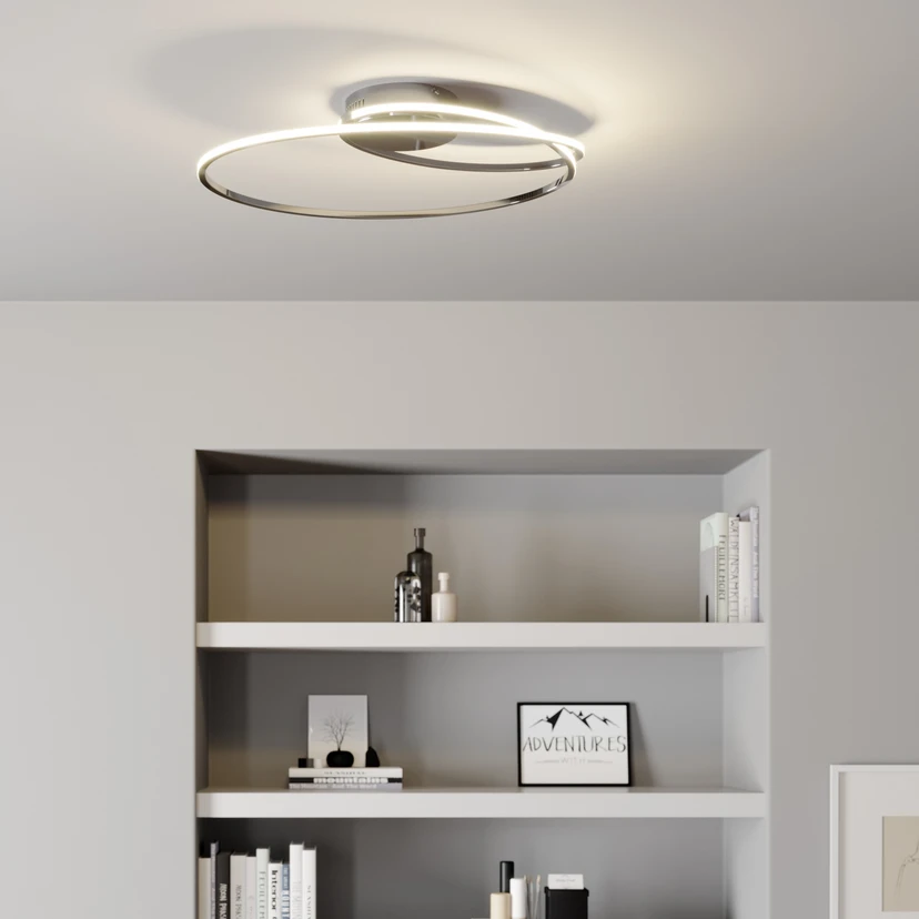Το φωτιστικό οροφής Xenias LED με δυνατότητα φωτισμού με ροοστάτη εντυπωσιάζει χάρη στο φουτουριστικό σχεδιασμό του Το φωτιστικό οροφής Xenias LED χαρακτηρίζεται από τα δύο διαπλεκόμενα οβάλ του. Το φωτιστικό παίζει με το γεωμετρικό σχήμα του κύκλου και εντυπωσιάζει με τη φουτουριστική του υλοποίηση. Η μοντέρνα σχεδιαστική ιδέα συμπληρώνεται από το χρωμιωμένο φωτιστικό σώμα, το οποίο ολοκληρώνει τέλεια το σχεδιασμό του φωτιστικού. Οι λυχνίες LED είναι τοποθετημένες στο εξωτερικό των οβάλ και εκπέμπουν το ζεστό λευκό φως τους ομοιόμορφα στο δωμάτιο. Τρία επίπεδα φωτεινότητας μπορούν να επιλεγούν μέσω ενός διακόπτη τοίχου, καθιστώντας το φωτιστικό ευέλικτο στη χρήση.