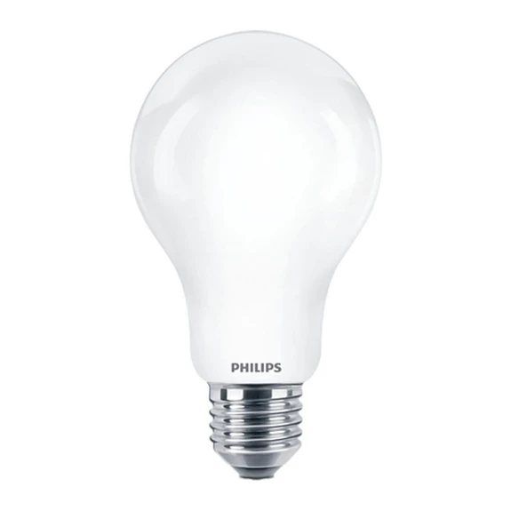 Φωτεινός λαμπτήρας LED E27 17,5W με θερμό λευκό φως (2.700 K) Αυτός ο λαμπτήρας LED είναι ιδανικός ως αντικαταστάτης ενός συμβατικού λαμπτήρα πυρακτώσεως 150 W σε κρεμαστά φωτιστικά σώματα στην κουζίνα ή σε άλλα φωτιστικά σώματα σε χώρους όπου απαιτείται φωτεινός αλλά άνετος φωτισμός. Το φως είναι απολύτως συγκρίσιμο όσον αφορά το χρώμα του φωτός και τη φωτεινότητα, ενώ η κατανάλωση ενέργειας είναι σχεδόν 90 % χαμηλότερη, με αποτέλεσμα τη σημαντική μείωση της κατανάλωσης ηλεκτρικής ενέργειας. Αυτή η πηγή φωτός πληροί τα κριτήρια EyeComfort που έχει αναπτύξει η Philips. Παράγει φως που είναι εύκολο για τα μάτια. Τεχνικά στοιχεία / χαρακτηριστικά - Συγκριτική τιμή: 150 Watt - Δεν μπορεί να ρυθμιστεί η ένταση του φωτός