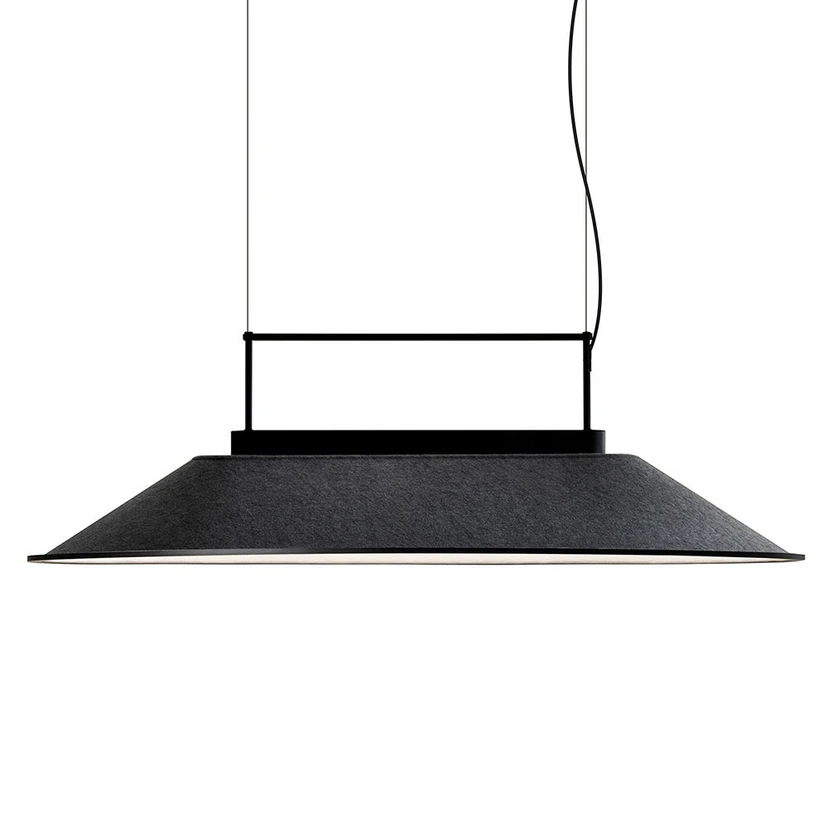 Επίμηκες κρεμαστό φωτιστικό LED Shoemaker με κάλυμμα από τσόχα που μειώνει τον θόρυβο Το Shoemaker αποτελείται από ένα μαύρο πλαίσιο και ένα γκρι, επίμηκες κάλυμμα από τσόχα. Η τσόχα δεν είναι μόνο ανθεκτική και μονωτική, αλλά και ανθεκτική στις φλόγες και ηχοαπορροφητική. Ο ηχομονωτικός της χαρακτήρας είναι σήμερα πιο σημαντικός από ποτέ. Στο γραφείο, το εστιατόριο ή την αίθουσα συνεδριάσεων, οι άνθρωποι θέλουν να αποσβένουν το θόρυβο για να προάγουν τη συγκέντρωση και να δημιουργήσουν μια πιο ευχάριστη ατμόσφαιρα. Χάρη στο υφασμάτινο σκίασμά του, το κρεμαστό φωτιστικό Shoemaker διαθέτει αυτή την ηχοαπορροφητική ιδιότητα και, ως εκ τούτου, αποτελεί δημοφιλή επιλογή. Οι μόνιμα εγκατεστημένες λυχνίες LED μπορούν να ρυθμιστούν ξεχωριστά ως προς το χρώμα και την ένταση του φωτός χάρη στη σύνδεση DALI. Το Shoemaker είναι επομένως κατάλληλο ως πολυλειτουργικό φωτιστικό για πολλούς χώρους, είτε για εργασία πάνω από τραπέζια σε αίθουσα συσκέψεων είτε για άνετο φωτισμό σε εστιατόριο - άπειρα ρυθμιζόμενα χρώματα φωτός (2.700K - 6.500K) - σχεδιασμένο από τον Joel Karlsson - συμπεριλαμβανομένου του ηλεκτρονικού ballast TRICONIC - μονάδα ελέγχου DALI DT8
