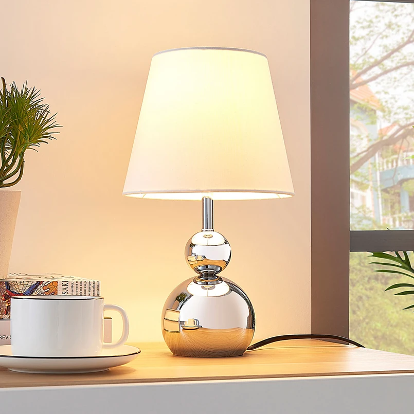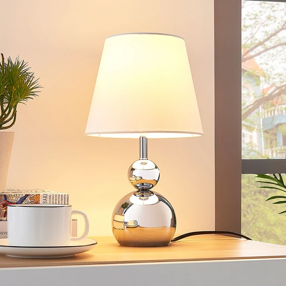 Όμορφο υφασμάτινο επιτραπέζιο φωτιστικό Andor με λευκή σκιά και ροοστάτη αφής 3 βημάτων Το Andor ταιριάζει απόλυτα στους μοντέρνους χώρους διαβίωσης και είναι ένα επιτραπέζιο φωτιστικό που αποπνέει κομψότητα. Η λευκή υφασμάτινη σκιά είναι κωνική προς την κορυφή και έχει στρογγυλό βασικό σχήμα. Χάρη σε αυτή την υφασμάτινη επιφάνεια, το φως λάμπει πολύ άνετα προς τα έξω, γι' αυτό και το υφασμάτινο επιτραπέζιο φωτιστικό Andor μπορεί να χρησιμοποιηθεί ως πλαϊνό φωτιστικό για άνετες βραδινές ώρες ή ως φωτιστικό δίπλα στο κρεβάτι. Ο χρωμιωμένος σχεδιασμός του σκελετού ολοκληρώνει αρμονικά την εμφάνιση και η φωτεινότητα μπορεί να ρυθμιστεί σε τρία στάδια με τη λειτουργία αφής στη βάση του φωτιστικού.