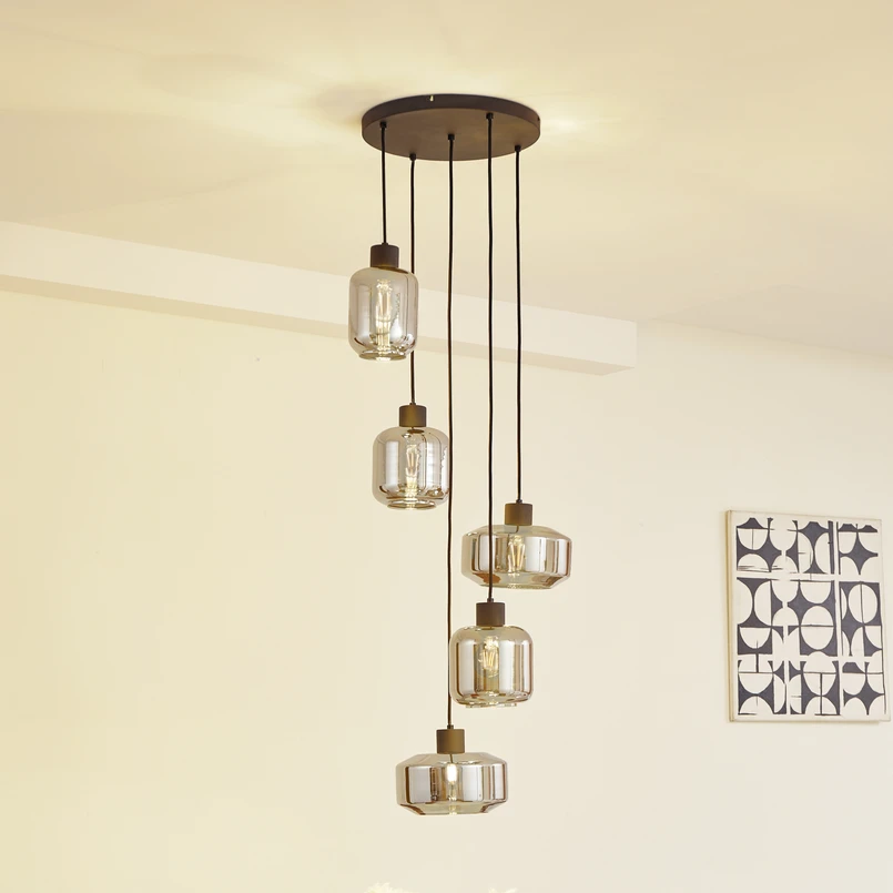 Κρεμαστό φωτιστικό Hildur σε γκρι καπνό με πέντε γυάλινες αποχρώσεις σε διαφορετικά μεγέθη Το κρεμαστό φωτιστικό Hildur, ένα αριστούργημα μοντέρνου σχεδιασμού, προσθέτει μια εξαιρετική ατμόσφαιρα σε κάθε σαλόνι ή τραπεζαρία. Με την κατασκευή του με 5 φωτιστικά τοποθετημένα σε στρογγυλή διάταξη, δημιουργεί ένα αρμονικό παιχνίδι φωτός που είναι ιδανικό τόσο για χαλάρωση όσο και για κοινωνικοποίηση. Ο συνδυασμός γυαλιού χρώματος καπνού και μαύρου φινιρίσματος τονίζει την κομψή κομψότητα αυτού του φωτιστικού στοιχείου. Παρόλο που αυτό το φωτιστικό δεν είναι εξοπλισμένο με ενσωματωμένο ροοστάτη, μπορεί εύκολα να συνδεθεί με εξωτερικό ροοστάτη για να ρυθμίσετε τη φωτεινότητα στις ατομικές προτιμήσεις (σημειώστε ότι ο εξωτερικός ροοστάτης πρέπει να αγοραστεί ξεχωριστά).
