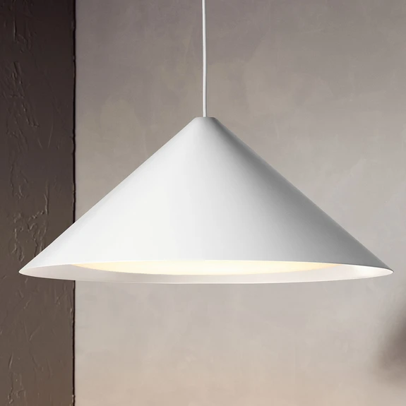 Κρεμαστό φωτιστικό LED Keglen - μινιμαλιστικό κωνικό κάλυμμα με διαχύτη σε σχήμα σταγόνας Το κρεμαστό φωτιστικό Keglen από τον παραδοσιακό δανό κατασκευαστή Louis Poulsen είναι ένα εξαιρετικό παράδειγμα του πώς ο αποτελεσματικός αλλά ευχάριστος φωτισμός και ο απλός αλλά κομψός σχεδιασμός μπορούν να συνδυαστούν σε ένα φωτιστικό. Η ιδέα προέρχεται από τον όμιλο Bjarke Ingels Group (BIG), μια διεθνώς ενεργή ένωση εμπειρογνωμόνων στους τομείς της αρχιτεκτονικής, του σχεδιασμού τοπίου, του εσωτερικού σχεδιασμού, της έρευνας και ανάπτυξης, του αστικού σχεδιασμού και του σχεδιασμού προϊόντων. Στο πλαίσιο του σχεδιασμού του Μουσείου Tirpitz στη Δανία, η BIG σχεδίασε, μεταξύ άλλων, το Keglen. Εκτός από τους δημόσιους χώρους, όπως εστιατόρια και αίθουσες συνεδριάσεων, το κρεμαστό φωτιστικό εντυπωσιάζει επίσης σε ιδιωτικά σαλόνια και τραπεζαρίες. Το ιδιαίτερο χαρακτηριστικό του κρεμαστού φωτιστικού είναι ο οργανικής εμφάνισης, καμπυλωτός διαχύτης από οπαλικό πολυκαρβονικό, ο οποίος μειώνει το φαινόμενο της θάμβωσης του φωτός που εκπέμπεται προς τα κάτω από τα εσωτερικά LED. Εκτός από το άμεσο φως ευρείας περιοχής, φωτίζεται επίσης διακριτικά και η οροφή. Για το σκοπό αυτό, υπάρχει ένα μικρό άνοιγμα στην άκρη του κωνικού σκιάστρου που στενεύει προς τα πάνω. Αυτό είναι κατασκευασμένο από αλουμίνιο, μονόχρωμο εξωτερικά και λευκό εσωτερικά - Εξωτερικά ρυθμιζόμενο μέσω του ελέγχου φάσης της εμπρόσθιας ακμής και του ελέγχου φάσης της οπίσθιας ακμής