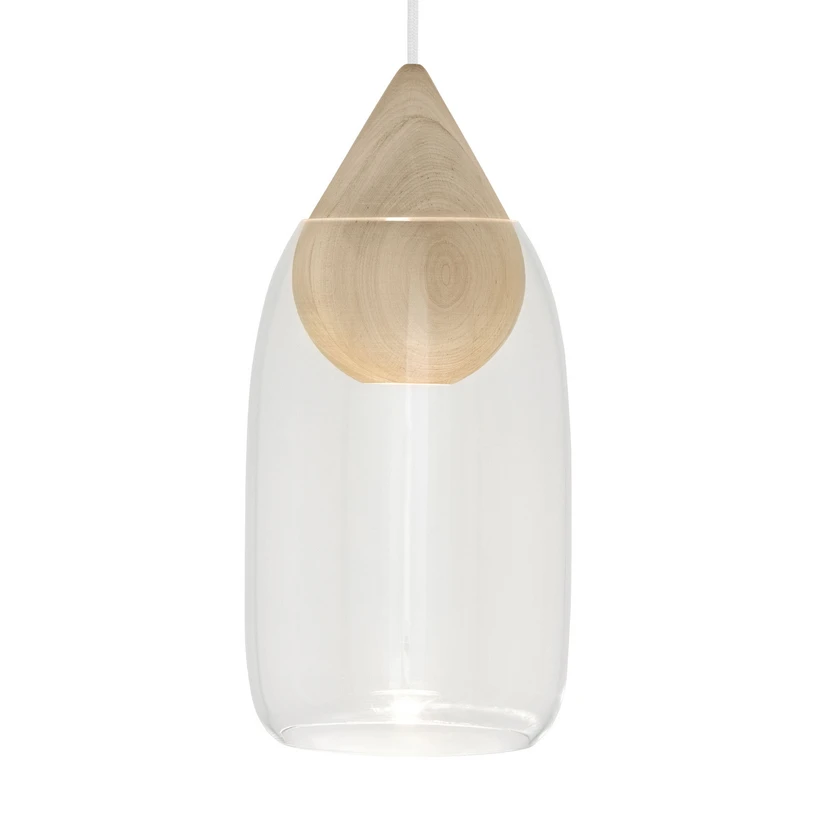 Liuku Drop κρεμαστό φωτιστικό σε κομψό, φυσικά εμπνευσμένο σχέδιο Αυτό το κρεμαστό φωτιστικό τραβάει τα βλέμματα ακόμα και όταν δεν είναι φωτισμένο, είτε ως επιτραπέζιος φωτισμός είτε για να φωτίσει ένα τμήμα ενός δωματίου. Το Liuku Drop αποτελείται από μια βάση σε σχήμα σταγόνας από ξύλο φλαμουριάς και από ένα κυλινδρικό, ελαφρώς βολβοειδές σκίαστρο από φυσητό γυαλί που περιβάλλει το ξύλο στο κάτω μέρος. Το ιδιαίτερο χαρακτηριστικό του Liuku Drop είναι ότι το ξύλινο στοιχείο, το οποίο είναι εφοδιασμένο με μια προς τα κάτω στραμμένη υποδοχή GU10, μπορεί επίσης να χρησιμοποιηθεί ως πηγή φωτός χωρίς γυάλινο σκίαστρο. Η σειρά φωτιστικών Liuku δημιουργήθηκε από τη φινλανδή σχεδιάστρια Maija Puoskari, οι ιδέες της οποίας εμπνέονται συχνά από μοτίβα της φύσης. Εκτός από τα φωτιστικά, το χαρτοφυλάκιό της περιλαμβάνει επίσης συλλογές επιτραπέζιων σκευών για γνωστές διεθνείς μάρκες. Το έργο της Puoskari αποτελεί μέρος της συλλογής του Kunstgewerbemuseum στο Βερολίνο από το 2017. Ο κατασκευαστής Mater παράγει υψηλής ποιότητας κομμάτια σχεδιαστών τόσο για τον ιδιωτικό όσο και για τον δημόσιο τομέα. Η διαδικασία παραγωγής χρησιμοποιεί παραδοσιακές τεχνικές χειροτεχνίας και βιώσιμα υλικά.