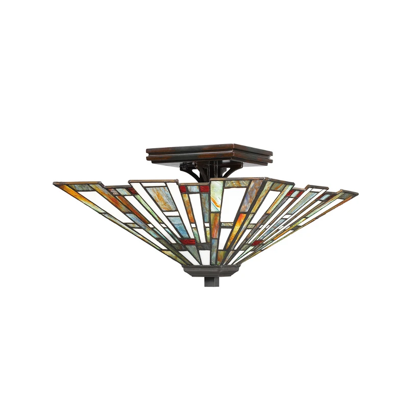 Γοητευτικό φωτιστικό οροφής Maybeck σε εμφάνιση Tiffany Οι αποχρώσεις σε σχέδιο Tiffany είναι δημοφιλείς, καθώς παρέχουν πάντα μια πολύχρωμη θέα του συνόλου. Το Maybeck είναι εξοπλισμένο με ένα γωνιακό σκίαστρο από μεμονωμένα στοιχεία γυαλιού τέχνης συναρμολογημένα σε στυλ Tiffany. Το πλαίσιο είναι κατασκευασμένο από χάλυβα και έχει φινίρισμα Valiant Bronze - εξωτερικά ρυθμιζόμενο