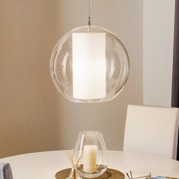 Γεωμετρικά σχεδιασμένο κρεμαστό φωτιστικό Bolla με υφασμάτινο εσωτερικό κάλυμμα Η διαφάνεια και η γεωμετρία είναι οι λέξεις-κλειδιά που έρχονται στο μυαλό σχετικά με την εμφάνιση του κρεμαστού φωτιστικού Bolla. Το σφαιρικό εξωτερικό κάλυμμα που ανοίγει προς τα κάτω είναι κατασκευασμένο από διαφανές πλαστικό και παρέχει θέα στο κυλινδρικό εσωτερικό κάλυμμα από λευκό ύφασμα, το οποίο φιλοξενεί την πηγή φωτός. Ο μινιμαλιστικός σχεδιασμός φαίνεται πολύ λεπτός όσο το φως είναι σβηστό. Όταν το φως είναι αναμμένο, λάμπει σε όλο το δωμάτιο και παρέχει αρμονικό φωτισμό χωρίς θάμβωση. Το φως μπορεί επίσης να χαμηλώσει με τη χρήση ενός εξωτερικού ροοστάτη - σχεδιασμένο από: Grasselli & Modo Luce R&D Το κρεμαστό φωτιστικό Bolla κατασκευάστηκε από την ιταλική εταιρεία Modo Luce, η οποία αντιπροσωπεύει δημιουργικές λύσεις φωτισμού που υλοποιούνται σύμφωνα με το σύνθημα "Δίνουμε στο φως μορφή".