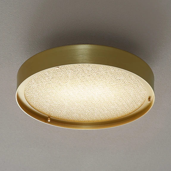 Συνδυάζει στρογγυλά σχήματα με ένα μείγμα υλικών από μέταλλο και αμμοβολημένο γυαλί. Ένας στρογγυλός δακτύλιος από μέταλλο με σατινέ φινίρισμα από ορείχαλκο συγκρατεί ένα δίσκο από συρματόπλεγμα, μέσω του οποίου διαχέεται το φως των δύο λαμπτήρων που πρέπει να τοποθετηθούν. Έτσι δημιουργείται ένας άμεσος φωτισμός, ο οποίος ταυτόχρονα φιλτράρεται από το γυάλινο διαχύτη.