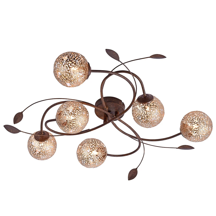 Greta - ένα ελικοειδώς σχεδιασμένο, 6-φωτεινό φωτιστικό οροφής Ένας ατσάλινος σκελετός με ρουστίκ σκουριασμένη εμφάνιση και έξι αμπαζούρ από διάτρητες, διάτρητες, χρυσές λακαρισμένες μεταλλικές σφαίρες - αυτά είναι τα υλικά που συνθέτουν το φωτιστικό οροφής Greta. Έχει ελαφρώς floral σχέδιο και είναι διακοσμημένο με όμορφες φυλλώδεις έλικες κατά μήκος των καμπύλων βραχιόνων του φωτιστικού. Ένας λαμπτήρας G9 (δεν περιλαμβάνεται) λάμπει σε κάθε ένα από τα έξι αμπαζούρ, το φως του οποίου μπορεί να λάμψει μόνο μέσα από τις διάτρητες οπές στο μέταλλο, δημιουργώντας ένα φανταστικό παιχνίδι φωτός και σκιάς στην οροφή. Μπορεί να ρυθμιστεί μέσω της οικιακής εγκατάστασης με τη χρήση ροοστάτη.