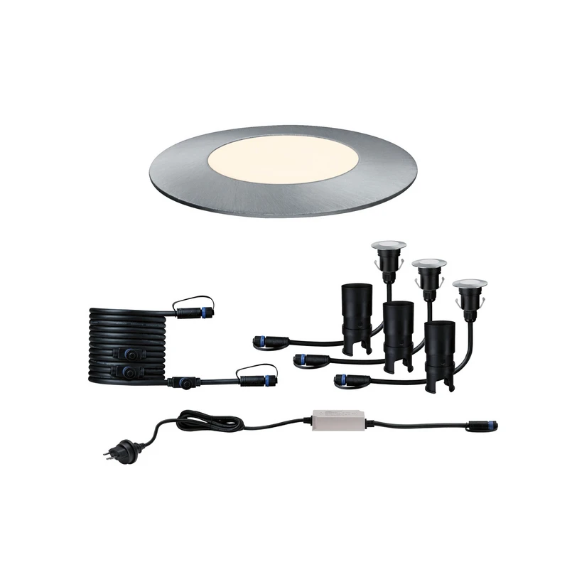 Μικρό και στρογγυλό φωτιστικό δαπέδου LED Plug & Shine Floor Mini, βασικό σετ με τρία φώτα Το βασικό σετ Floor Mini από τη σειρά Plug & Shine περιλαμβάνει όλα τα απαραίτητα εξαρτήματα για να ξεκινήσετε να φωτίζετε τον εξωτερικό σας χώρο. Μπορεί να επεκταθεί με καλώδια προέκτασης και άλλα φωτιστικά της σειράς Plug & Shine (βλ. αξεσουάρ). Το βασικό σετ περιλαμβάνει τρία φωτιστικά LED Floor Mini με πλαίσιο από ανοξείδωτο χάλυβα και ματ πλαστικό κάλυμμα Ανάλογα με τη θέση, είναι δυνατή η εγκατάσταση στο έδαφος ή σε ενδιάμεσα δάπεδα (0,3 έως 2 cm). Τα φώτα είναι ιδανικά ως φωτισμός προσανατολισμού ή έμφασης - Με τάση λειτουργίας 24 V και προστατευμένα από το νερό καλώδια, συνδέσεις και φώτα, το Plug & Shine της Paulmann είναι μια ευέλικτη και ασφαλής λύση φωτισμού για εξωτερικούς χώρους - Περιεχόμενο παράδοσης: τρία φώτα, βυσματικός μετασχηματιστής, καλώδιο σύνδεσης - Μπορεί πάντα να ενεργοποιηθεί και να απενεργοποιηθεί μέσω διακόπτη φωτισμού - Για τον έλεγχο μέσω τηλεχειριστηρίου/ZigBee απαιτείται μια πύλη ελεγκτή/ZigBee (βλ. αξεσουάρ) - Μέγιστο μήκος καλωδίου πηγή ενέργειας - φως: 50 m - Ανθεκτικό στο νερό της πισίνας