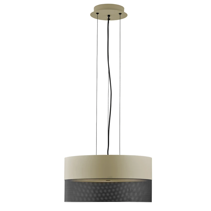 Mesh κρεμαστό φωτιστικό από αλουμίνιο Το μεγάλο σκίαστρο του κρεμαστού φωτιστικού Mesh είναι κατασκευασμένο από χρωματιστό λακαρισμένο αλουμίνιο στο πάνω μέρος και διάτρητο υλικό στο κάτω μέρος, το οποίο μοιάζει με δίχτυ. Κρέμεται από το στρογγυλό θόλο με τρία ατσάλινα καλώδια και είναι εξοπλισμένο με τρεις υποδοχές E27. Ένας διαχύτης στο κάλυμμα εξασφαλίζει φωτισμό χωρίς θάμβωση και κρύβει τις πηγές φωτός. Εξοπλισμένο με φωτεινές πηγές με δυνατότητα ρύθμισης του φωτισμού, το φως μπορεί επίσης να ρυθμιστεί με εξωτερικό ροοστάτη. Οι λαμπτήρες δεν παρέχονται.