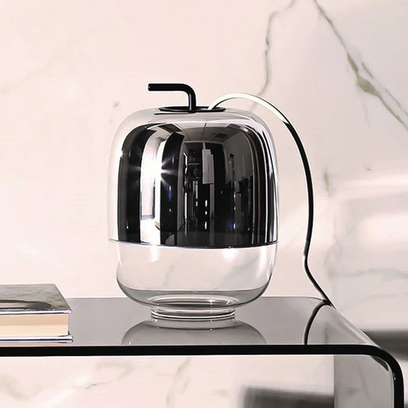 Επιτραπέζιο φωτιστικό Gong T1 από γυαλί, φυσητό στο χέρι Το επιτραπέζιο φωτιστικό Gong T1 αποτελείται σχεδόν εξ ολοκλήρου από ένα φυσητό στο χέρι γυάλινο κάλυμμα. Αυτό έχει δίχρωμο σχεδιασμό και καθιστά το φωτιστικό μια λαμπρή πηγή φωτός που ταιριάζει σε πολλά δωμάτια και στυλ επίπλωσης. Ενώ το κατώτερο τμήμα του γυάλινου καλύμματος είναι διαφανές, το μεγαλύτερο ανώτερο τμήμα είναι χρωματισμένο ή μεταλλοποιημένο. Το επιτραπέζιο φωτιστικό Gong T1 είναι ένα ποιοτικό φωτιστικό από την Prandina. Η ιταλική εταιρεία ιδρύθηκε το 1982 από τον Sergio Prandina. Ο ίδιος σχεδίασε επίσης τη σειρά φωτιστικών Gong. Η Prandina κατασκευάζει υψηλής ποιότητας δημιουργίες φωτισμού, κυρίως με φυσητά γυάλινα καλύμματα, τα οποία έχουν υψηλή αξία αναγνώρισης και χαρακτηρίζονται από τελειότητα και πρωτοποριακή ποιότητα. Η Prandina συνεργάζεται με παγκοσμίου φήμης αρχιτέκτονες και σχεδιαστές.