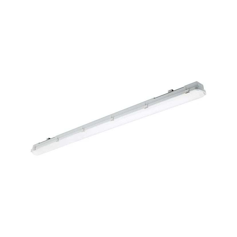 Resisto 1500 Φωτιστικό σώμα LED με προστασία από την υγρασία με βαθμό προστασίας IP66, λευκό γενικής χρήσης Το φωτιστικό σώμα LED με διάχυση, το οποίο έχει υψηλό βαθμό προστασίας IP66 από τη σκόνη και τους ισχυρούς πίδακες νερού, είναι στιβαρό και ανθεκτικό. Είναι εξοπλισμένο με επίπεδο διαχύτη σταθεροποιημένο στην υπεριώδη ακτινοβολία, ο οποίος δεν κιτρινίζει με την πάροδο του χρόνου, εξασφαλίζει ομοιόμορφο φωτεινό μοτίβο, βελτιστοποιεί την απόδοση του συστήματος και μειώνει την αντανάκλαση - βαθμός προστασίας IP66 - δείκτης αντοχής σε κρούση IK08 - διάρκεια ζωής 69.000 ώρες (L80 B20) - διαχύτης από πολυανθρακικό - δεν κιτρινίζει με την πάροδο του χρόνου - συμπ. κλιπ διαχύτη και βραχίονες στήριξης από ανοξείδωτο χάλυβα 301
