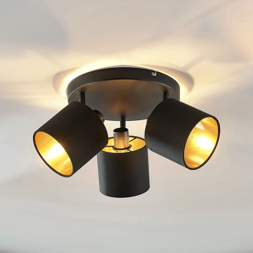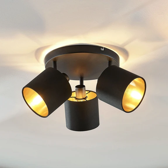 Υφασμάτινο φωτιστικό οροφής Vasilia σε μαύρο και χρυσό, 3-φωτο.