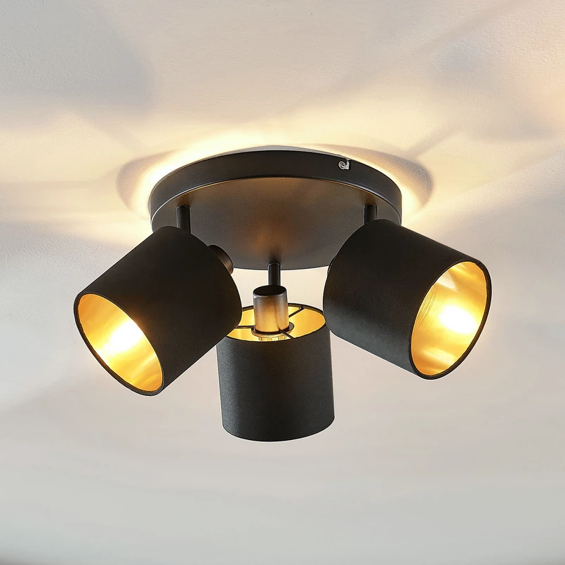 Υφασμάτινο φωτιστικό οροφής Vasilia σε μαύρο και χρυσό Με τα τρία ξεχωριστά ρυθμιζόμενα φώτα του όμορφα σχεδιασμένου φωτιστικού οροφής Vasilia μπορούν να φωτιστούν ατμοσφαιρικά ακόμη και μεγαλύτεροι χώροι. Είτε πρόκειται για την κουζίνα, το σαλόνι, την κρεβατοκάμαρα ή το γραφείο, καμία γωνιά δεν παραμένει σκοτεινή με αυτό το φωτιστικό. Το εξωτερικό του φωτιστικού οροφής έχει βαθύ μαύρο χρώμα, το οποίο ενσωματώνεται διακριτικά στο εσωτερικό του σπιτιού. Εν τω μεταξύ, το αποκορύφωμα είναι το χρυσό εσωτερικό, το οποίο παρέχει μια εκλεπτυσμένη λάμψη και ολοκληρώνει όμορφα το γραμμικό σχέδιο με υφασμάτινο κάλυμμα.